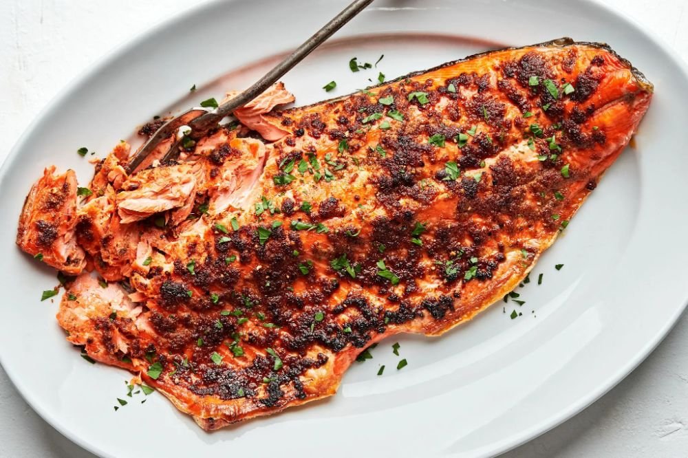 A premium salmon filet broiled to perfection, creating a caramelized, golden crust over a tender, moist interior. Lightly seasoned with lemon, garlic, and fresh herbs, this dish offers a rich, buttery flavor that melts in your mouth—a healthy yet indulgent choice.