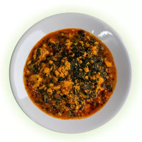 Nutty ground melon seed stew cooked with assorted meats and spinach.